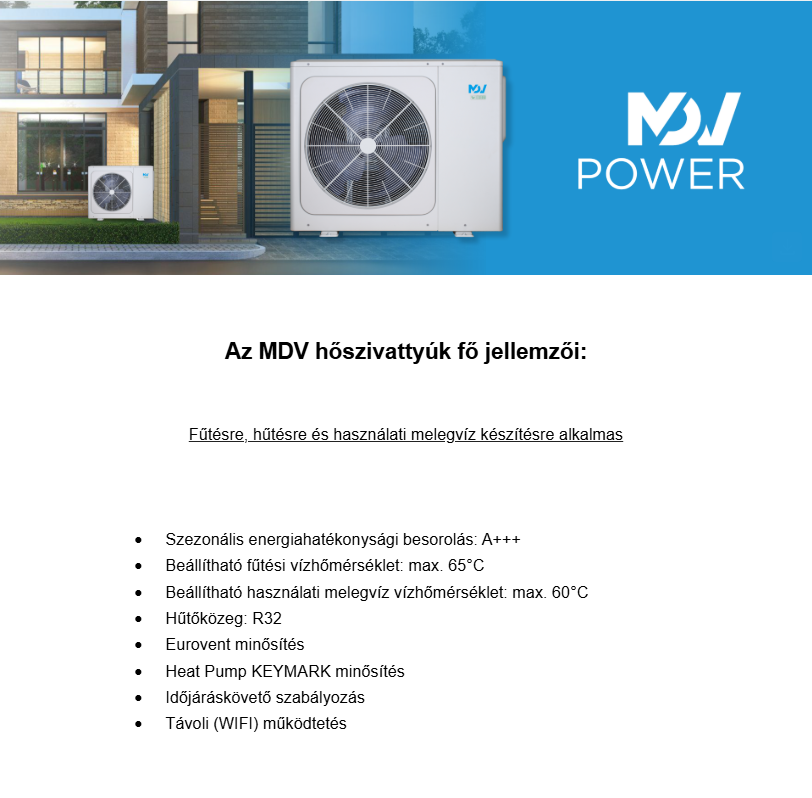 Ön éppen véleményezi: MDV MDVC-V16WD2BR8-P MDV Power monoblokkos hőszivattyú (R32, 16 kW, 3 fázis)